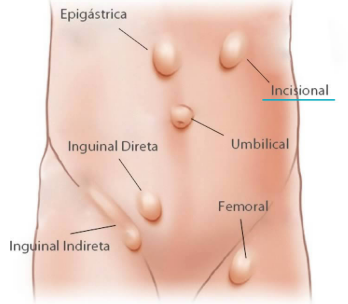 As hérnias podem aparecer em diferentes regiões. As mais comuns são:
